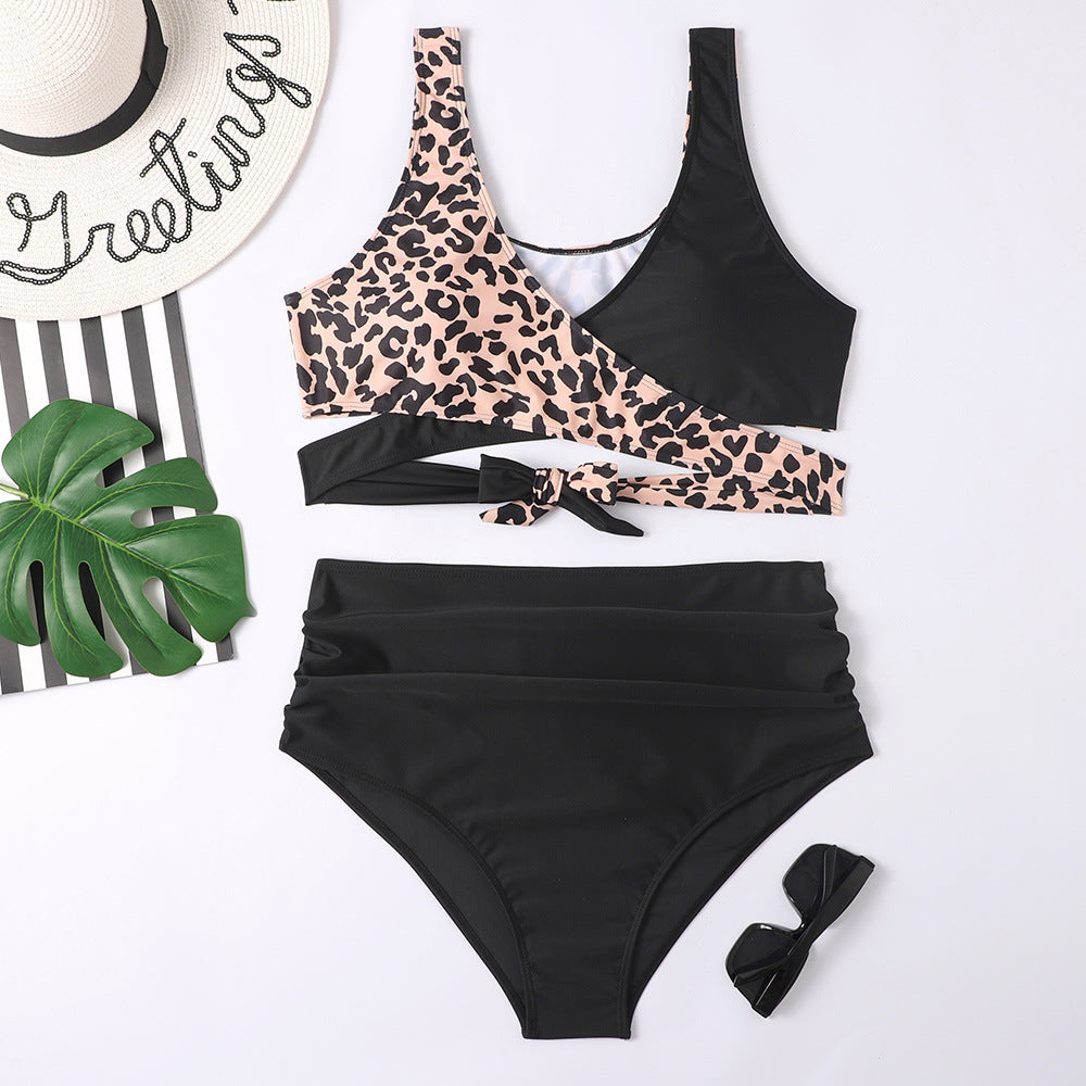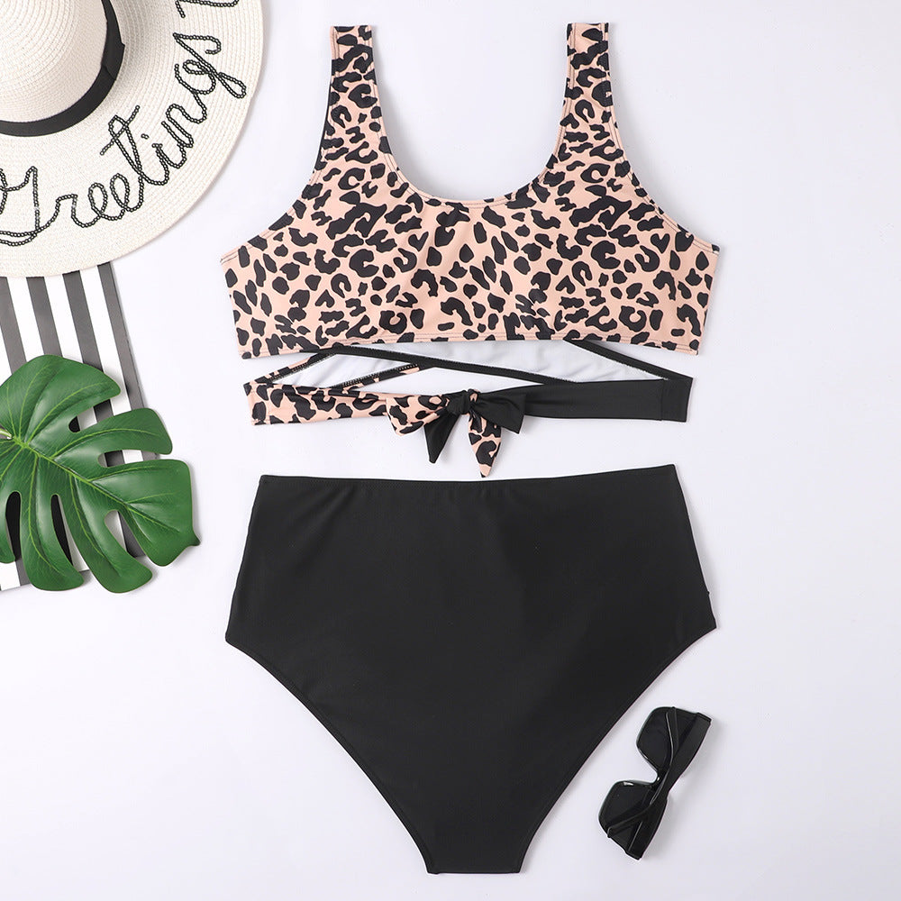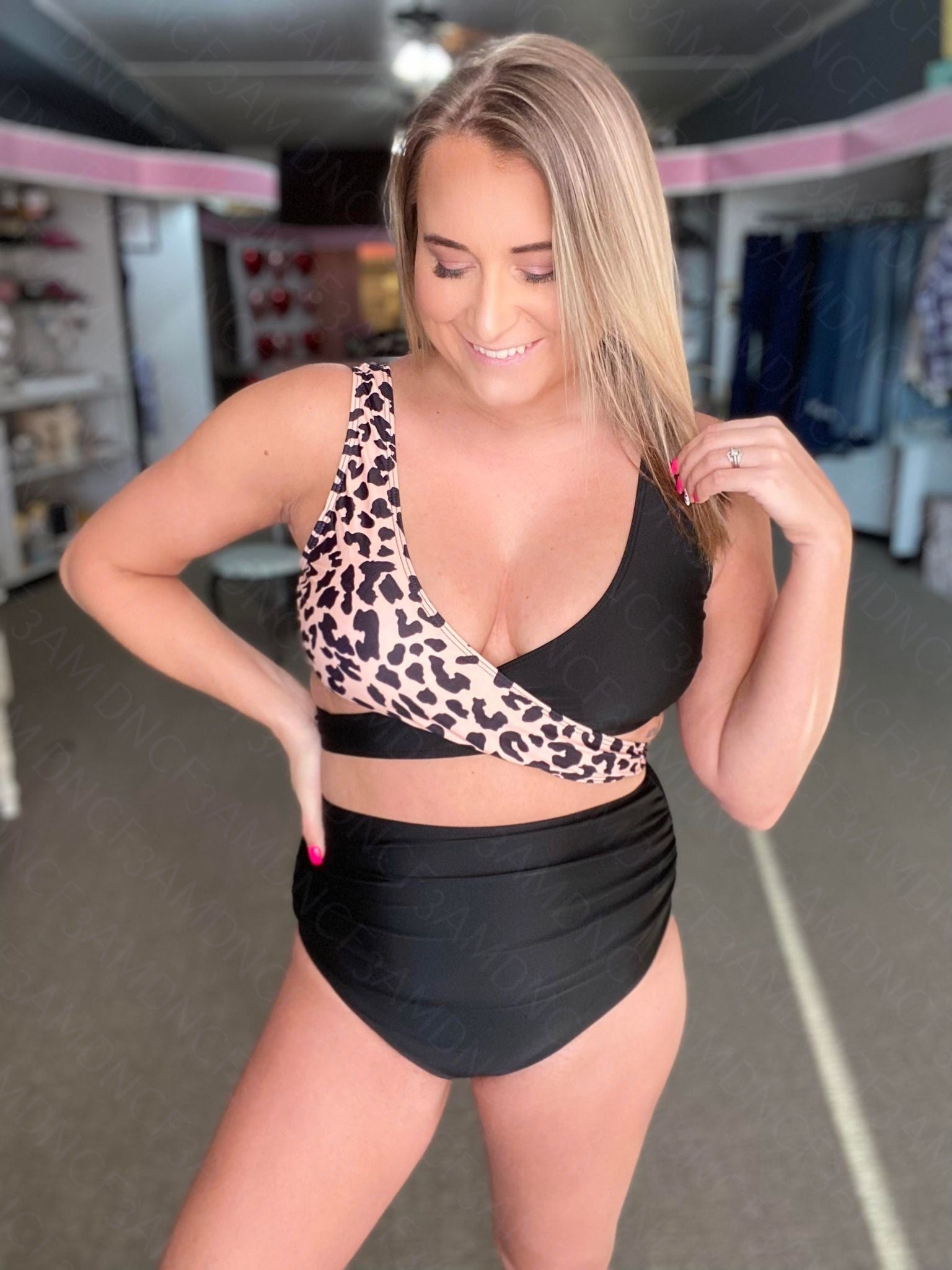Cross tie leopard top and high waist bottoms. Ashley Goedde is in an XL, her normal size is a large but please watch fit video for more details. She is obsessed, ya'll.